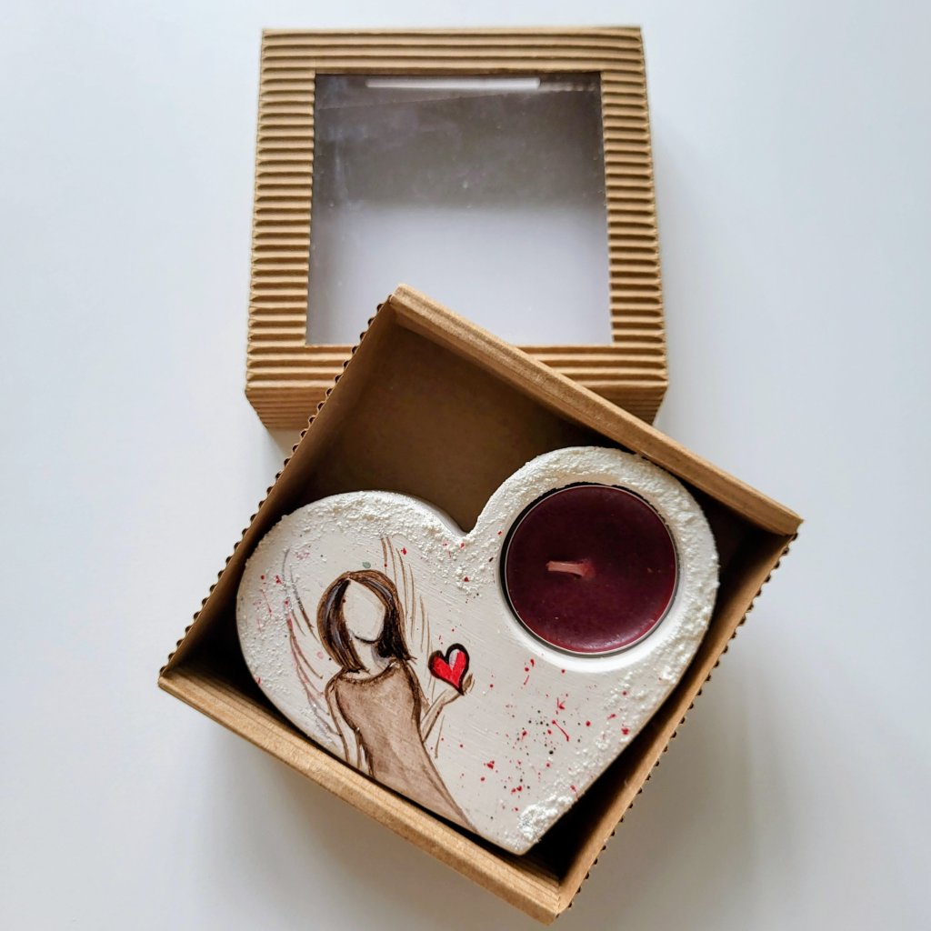 Tento malý andělský svícen ve tvaru srdíčka je ručně malovaný a zdobí jej jemná malba andílka. Paní Lucie, naše dlouhodobá a velmi laskavá dárkyně, nakupuje své dárky v chráněných dílnách a pak je s láskou věnuje do Tržiště radosti, čímž podporuje nejen nás, ale i samotné tvůrce – radost se tak násobí. Mini svícen je originální a přináší pocit klidu a pohody, skvěle poslouží jako dekorace nebo drobný dárek.
