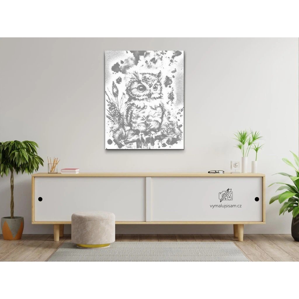 Obraz „Barevná sova“ je určený k malování technikou tečkování – metodou, která uklidňuje, rozvíjí trpělivost a přináší radost z každé dokončené tečky. Plátno má rozměr 40 × 50 cm, je černé barvy a napnuté na vnitřním rámu, takže po dokončení může rovnou zdobit zeď.