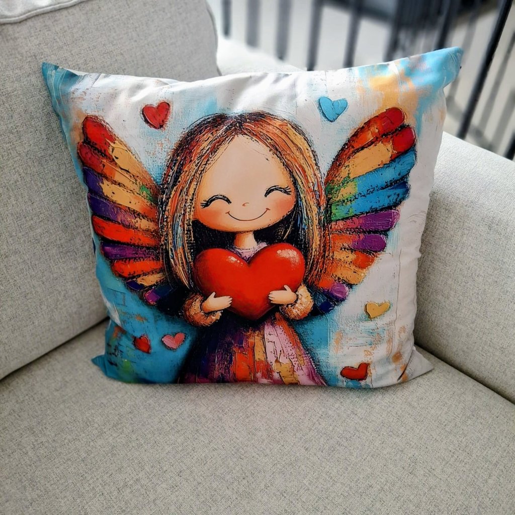 Veselý polštářek s andělskou holčičkou a barevnými křídly – radost pro malé i velké.