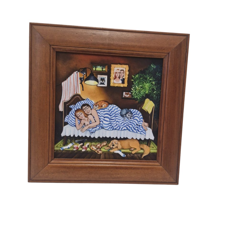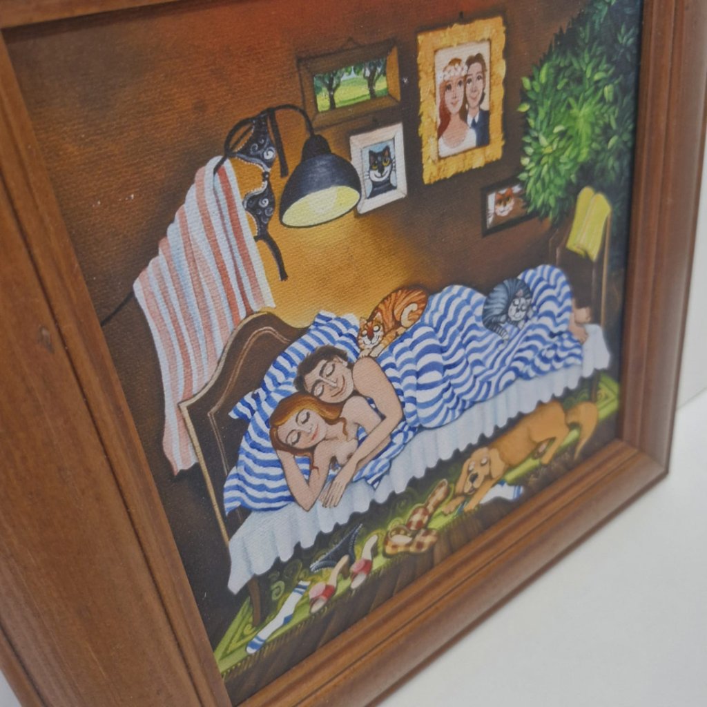 Reprodukce obrazu „Čtyři v posteli“ od Zuzany Honsové přináší úsměv a něhu. Inspirací byla básnička kamarádky Ivky Lehkoživky: „Máš moc práce? Stres a splín? Pomůže ti – já to vím… Terapie mazlením.“