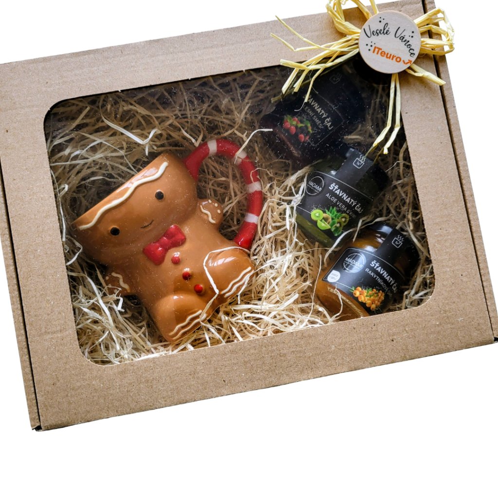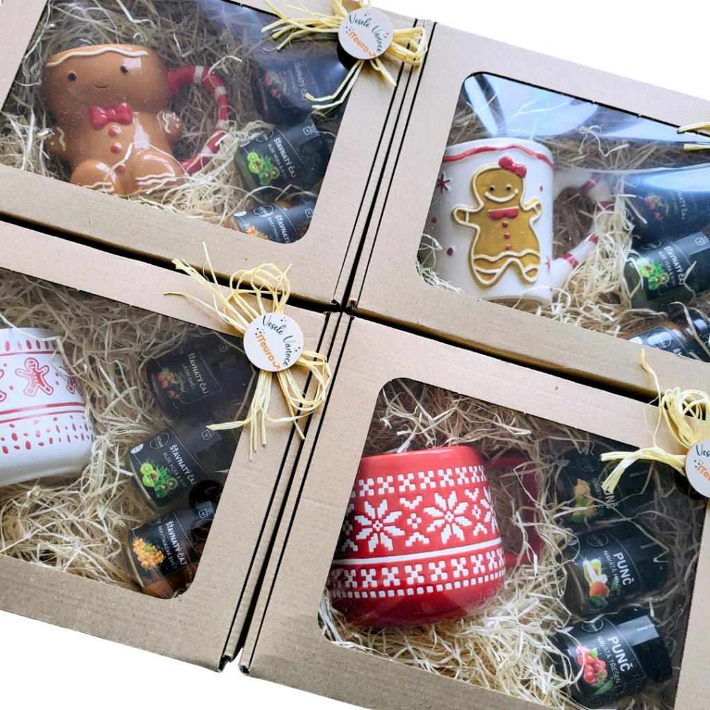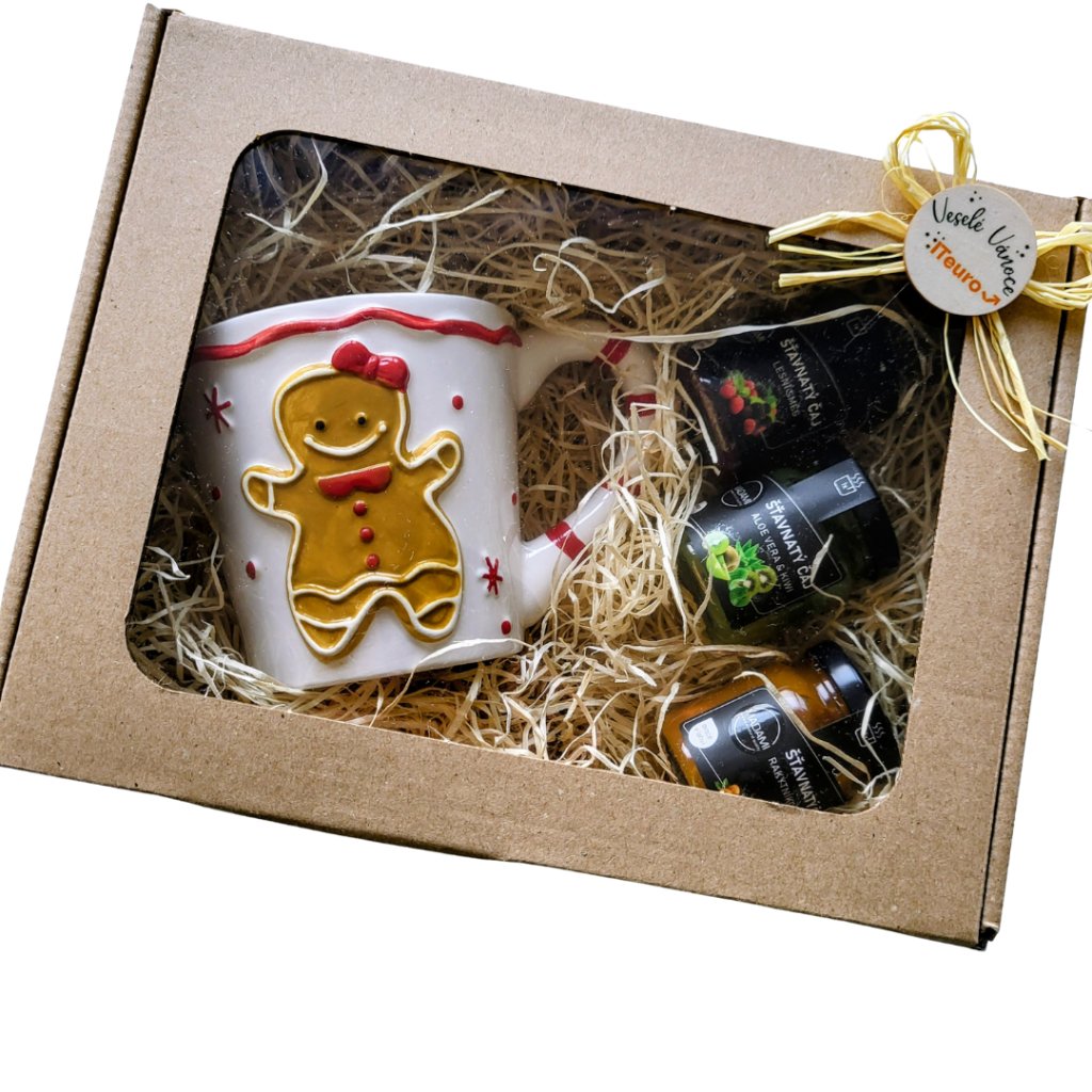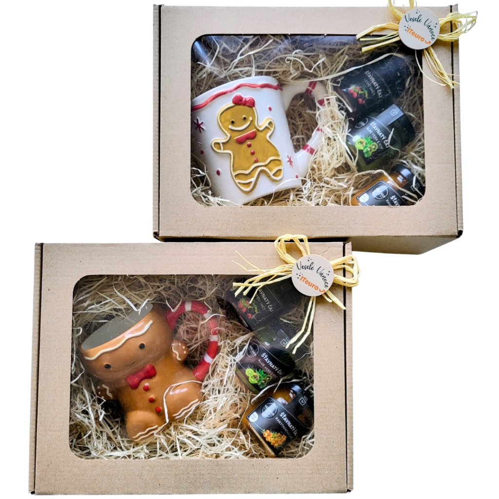 Voňavě zimní! Dva hrnečky s perníčkovým motivem a tři čaje ve skle – sada, která zahřeje duši i ruce.