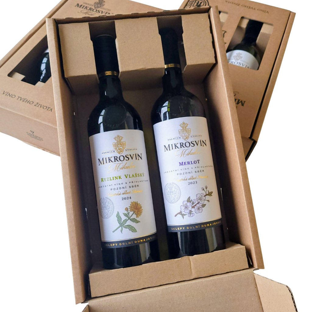 Dvě vína, dva charaktery – Ryzlink vlašský a Merlot z vinařství Mikrosvín. Elegantní sada pro chvíle, kdy se chcete zastavit a vychutnat život.