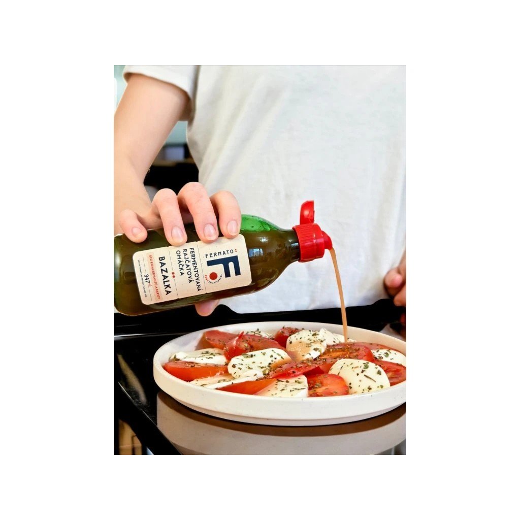 Značka FerMato připravila něco skutečně výjimečného: zralá rajčata, čerstvý zázvor a česnek jsme společně s nimi nechali fermentovat a celý proces završili přidáním čerstvé svěží bazalky. Výsledkem je zálivka s bohatou chutí — sladkou, slanou, kyselou i umami — a bazalka ji dává jemný zelený nádech.