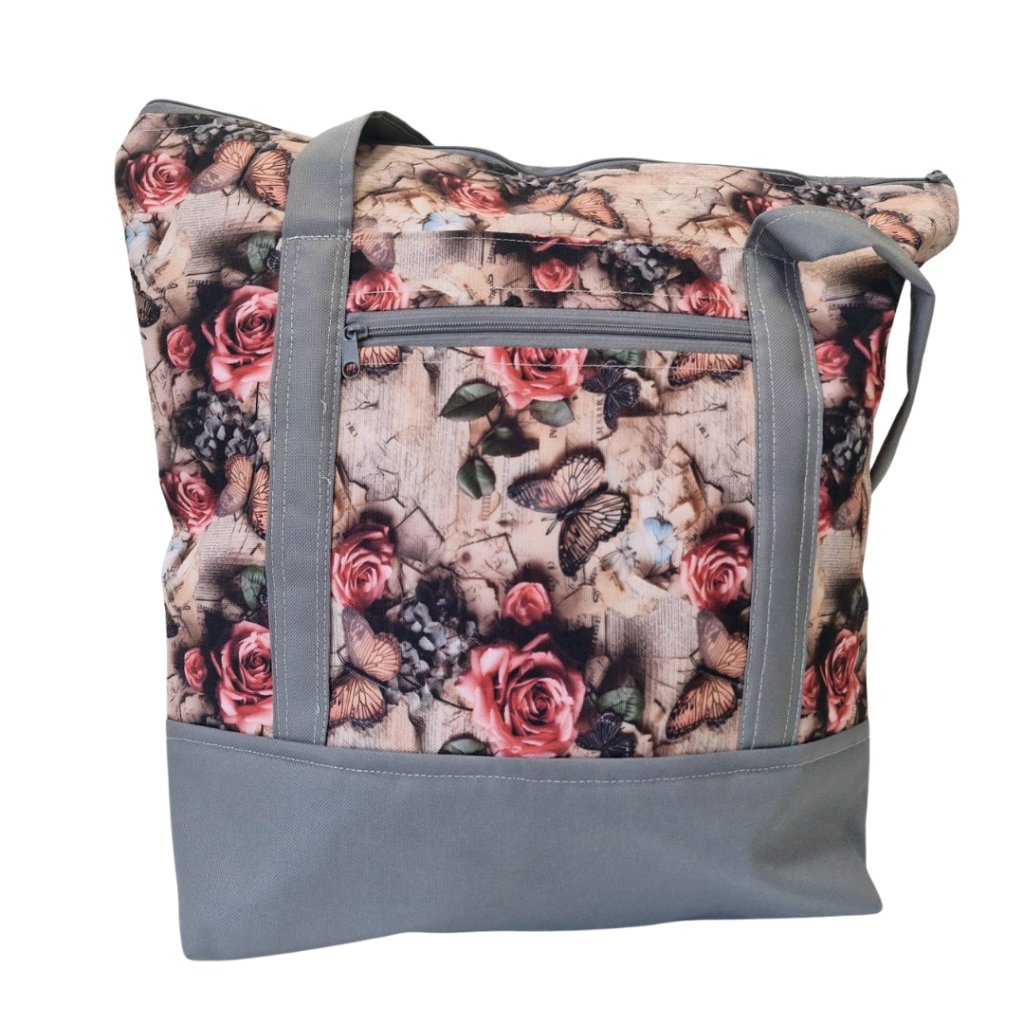 Romantická látková kabelka s motivem růží a motýlků, doplněná šedými uchy pro jemný kontrast.