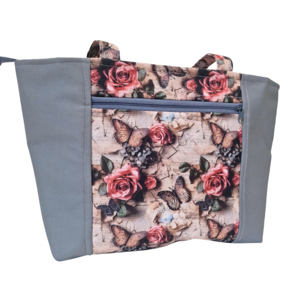 Lehká látková kabelka s romantickým motivem růží a motýlků – pro radost z každého dne.