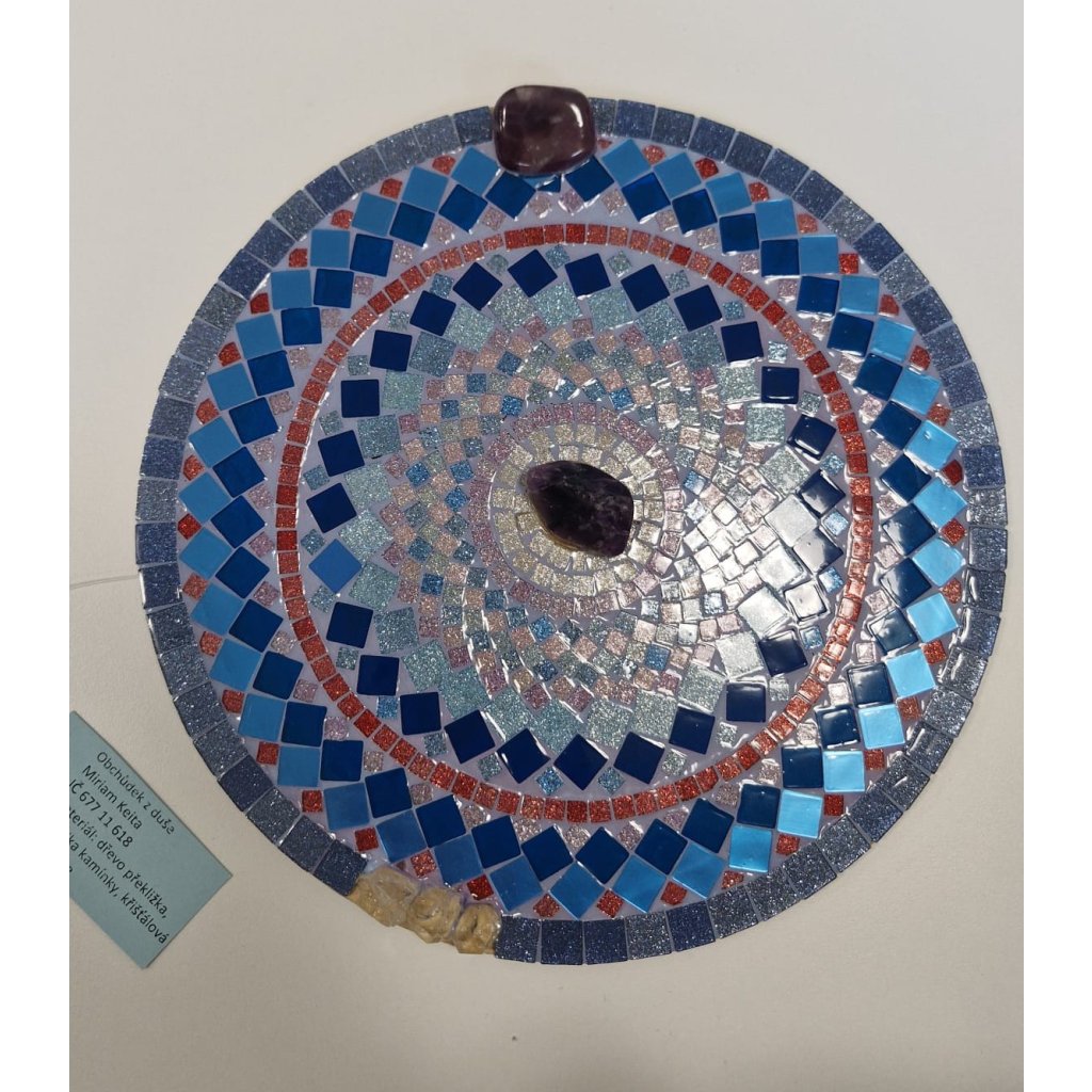 Mandala je ručně vytvořena z kamínků z pryskyřice a zalita do křišťálové pryskyřice, která má efekt skla. Nachází se na ní fluorit, ametyst a křišťál. Je určena spíše do interiéru, může být zavěšená nebo položena a dá se otřít. Jelikož je tvořena na dřevěném podkladu, není vhodné ji namáčet; pokud se poleje, stačí otřít. Průměr mozaiky je cca 22 cm a je uzpůsobená i k zavěšení.