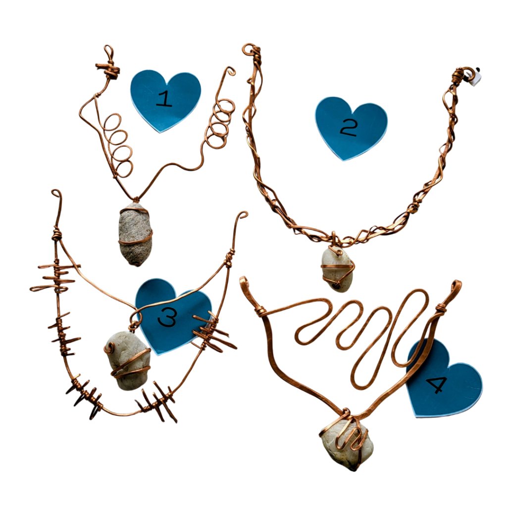 Tyto náhrdelníky představují jednoduchou, přirozenou krásu. Každý kousek kombinuje výrazný kámen jako přívěsek s kovovou „hlavičkou“ – pravděpodobně mosaznou – a nechává na vás, abyste mu dodali vlastní šňůrku nebo řetízek dle vkusu.