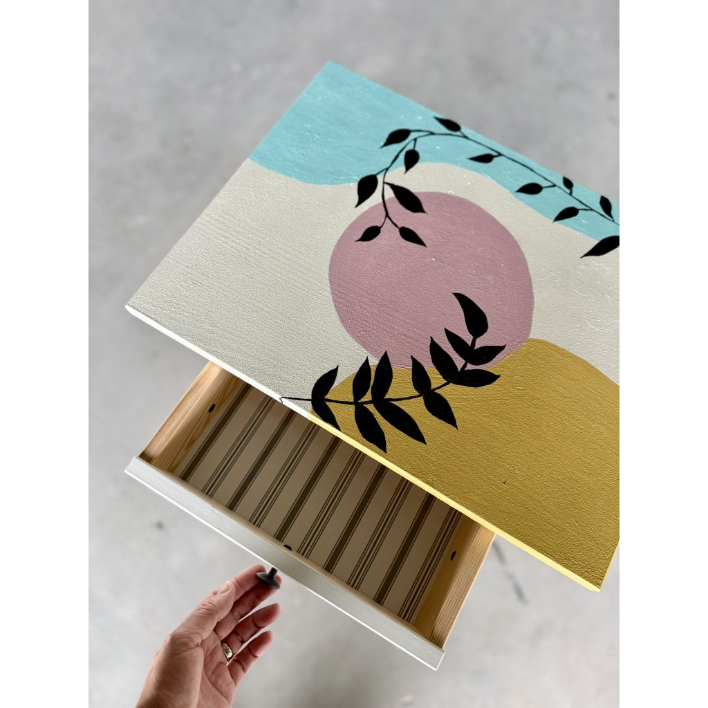 Noční stolek se zúčastnil speciální akce IKEA Ostrava a Avion Shopping Park Ostrava, kde si lidé mohli vyzkoušet malování na vybrané kousky nábytku a dekorací. Tento stolek nese jedinečný rukopis jeho malíře a výsledek je jemný, vkusný a originální. Každý kus je díky tomu neopakovatelný a přináší do interiéru trochu zábavy a uměleckého ducha.