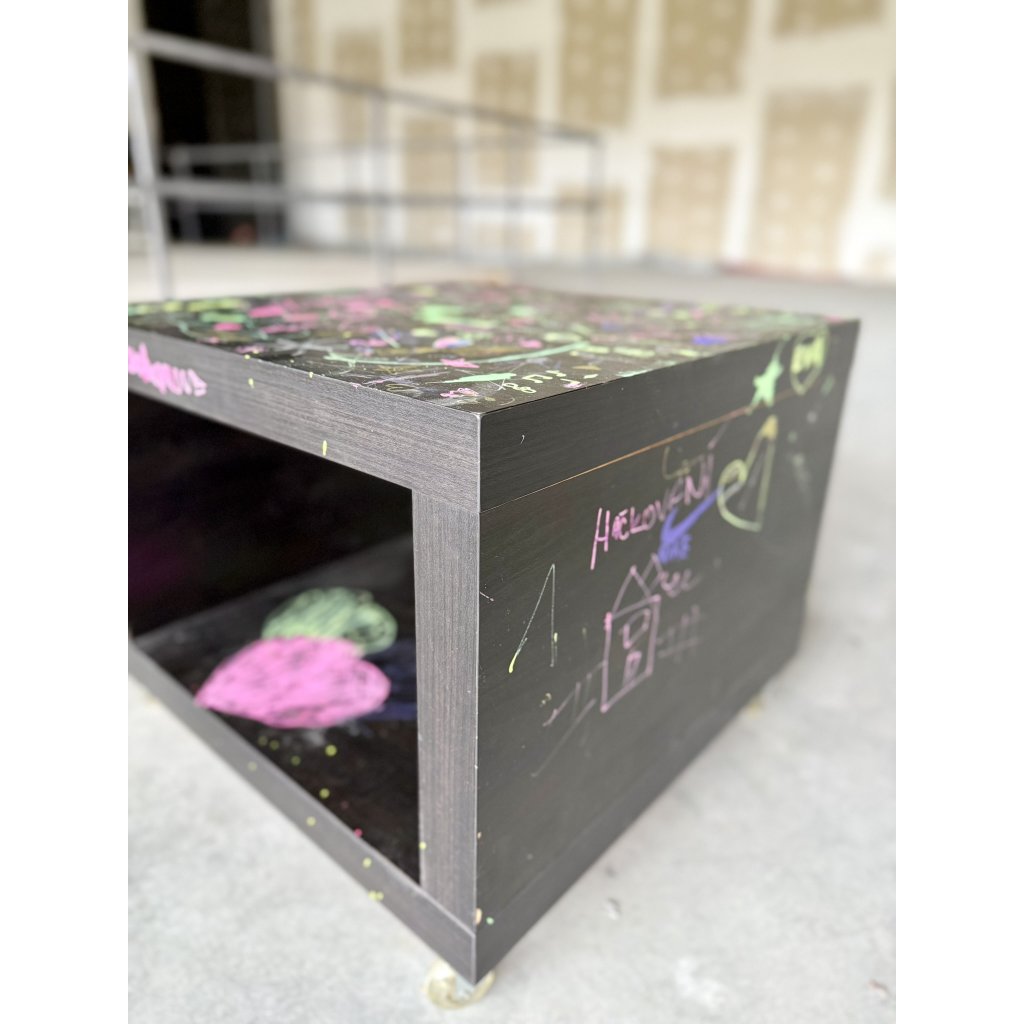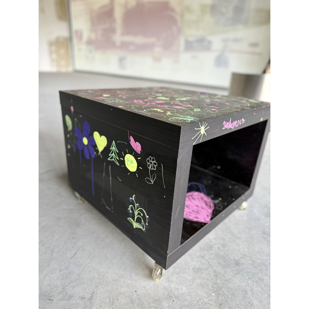 Originální a hravý! Tento černý stolek není jen stolek – je to malé umělecké dílo, na kterém děti rozvinuly svou fantazii. Každá skvrnka a tah štětcem je součástí jeho jedinečného kouzla.