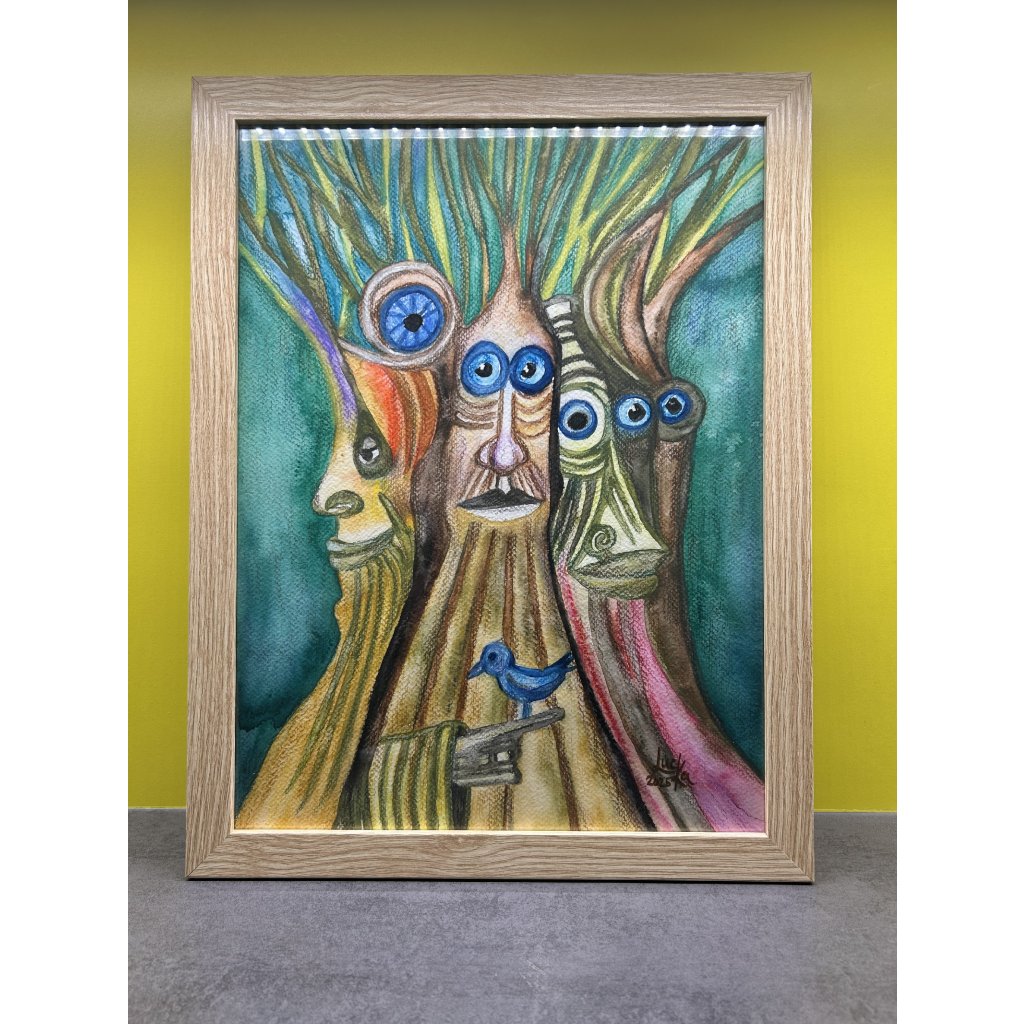 Obraz „Čarovný les“ je malovaný akvarelovým pastelem a zarámovaný ve vkusném rámečku o rozměrech cca 34 × 44 cm, připravený k okamžitému zavěšení nebo vystavení.
