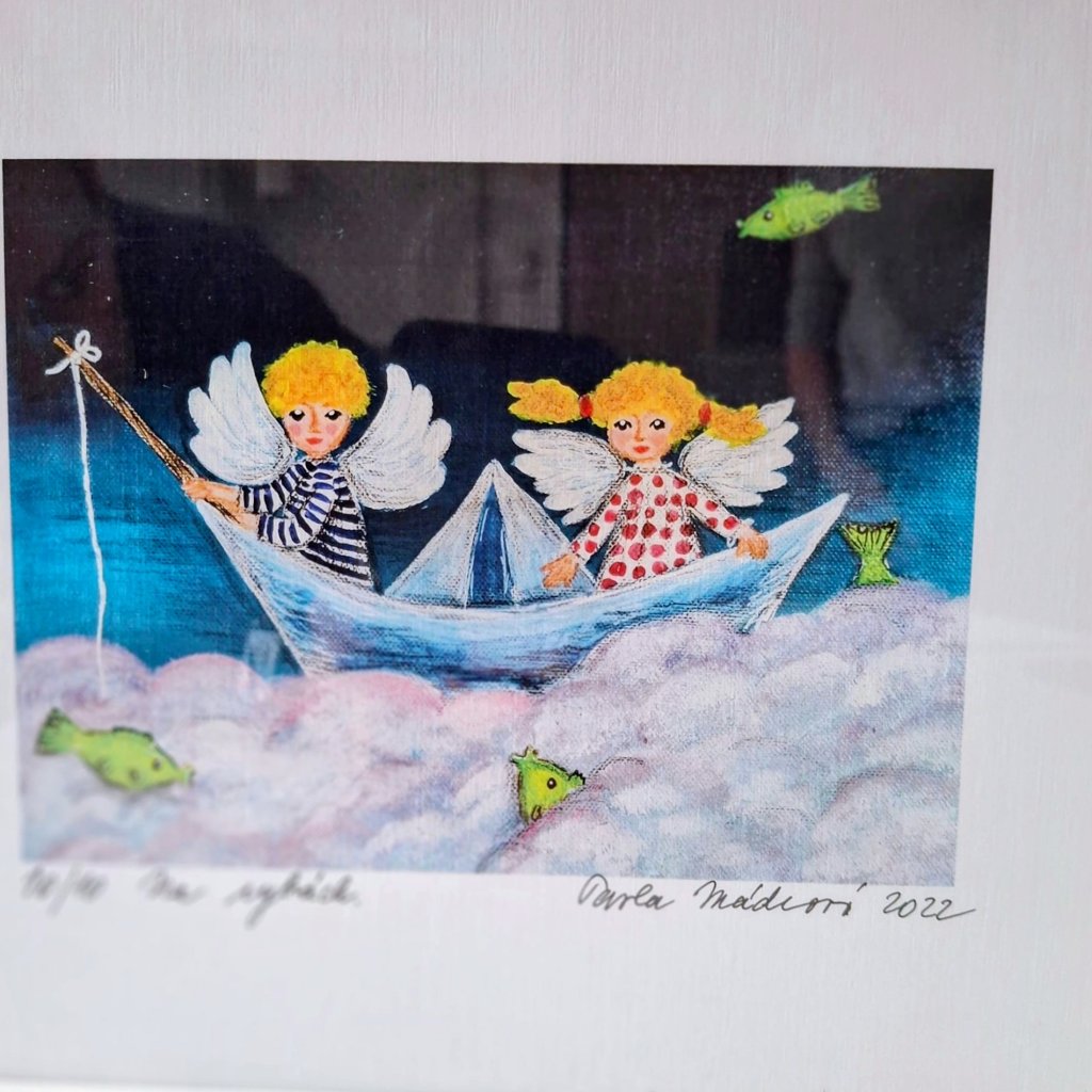 Tisk obrazu od Pavlínk Mádrové s andělátky Na rybách, tisk na kvalitní papír se strukturou napodobující plátn,, obrázek je tištěný s bílou paspartou.