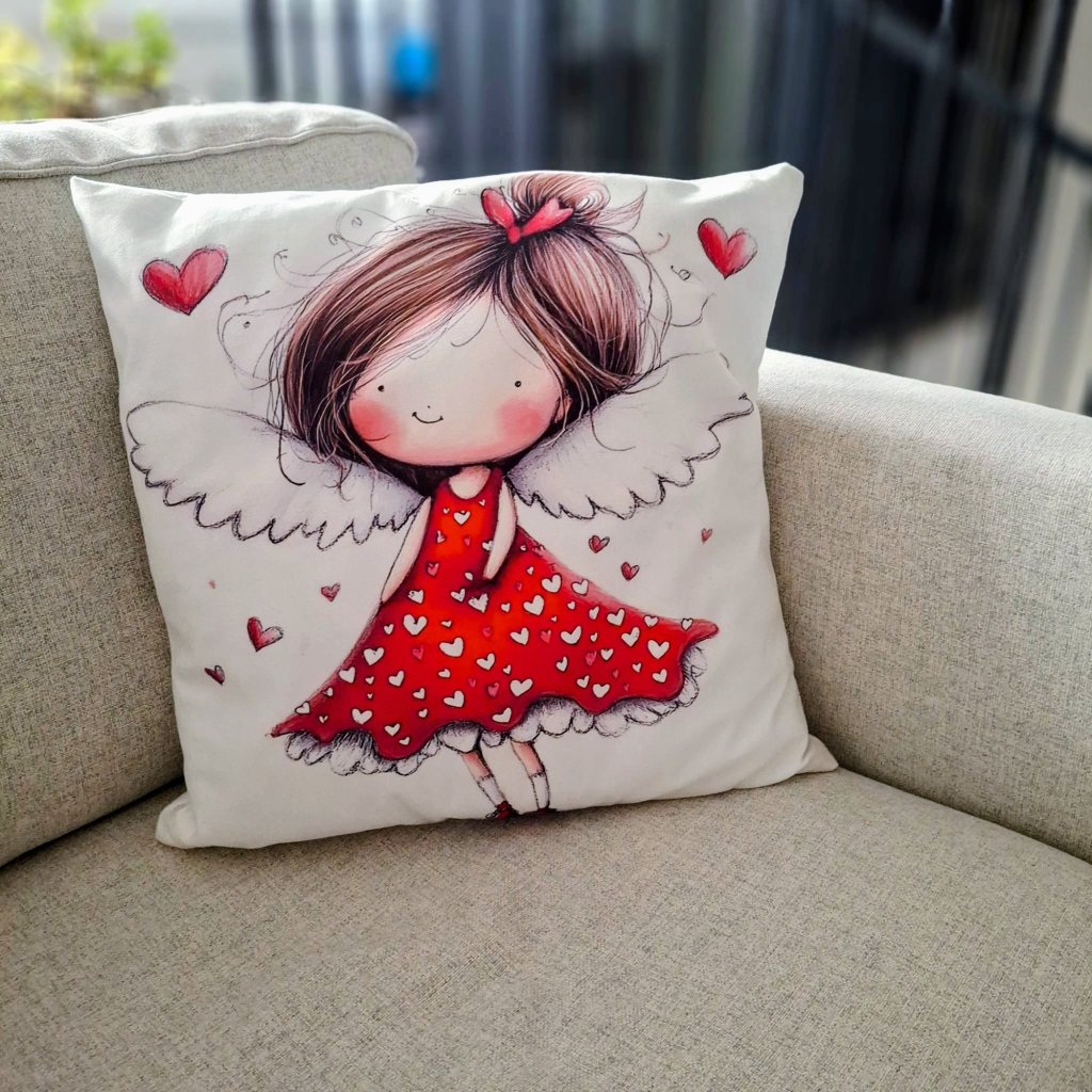 Kouzelný polštářek s andělskou holčičkou v červených šatech – hebký kousek radosti.
