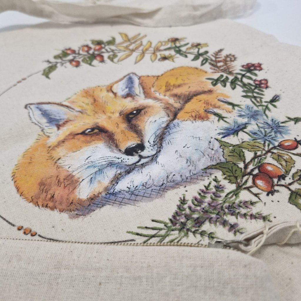 Liščí klid a moudrost v barvách. Originální malba na tašce od Karly Kůlové, s jemností a osobním dotekem.