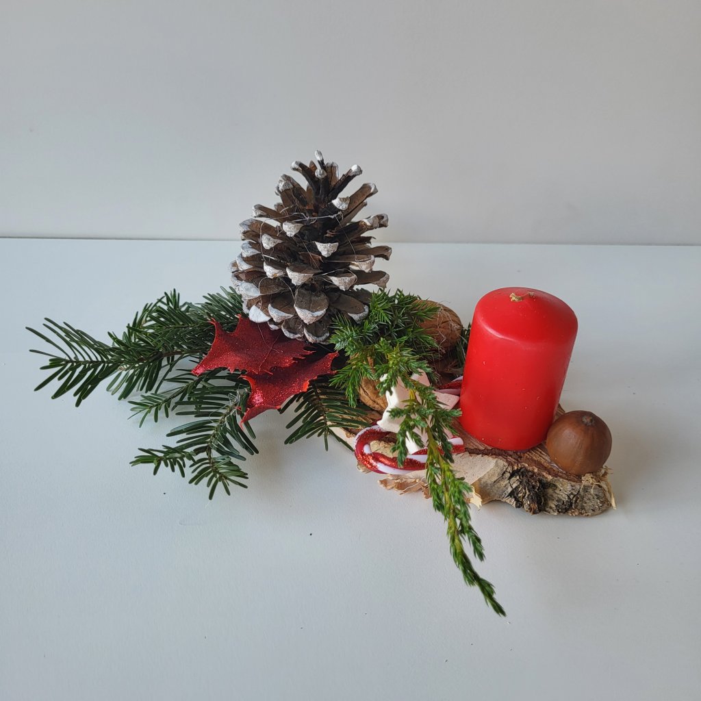 Malý svícen, velká vánoční nálada – přírodní dekorace s červenou svíčkou a šiškou.