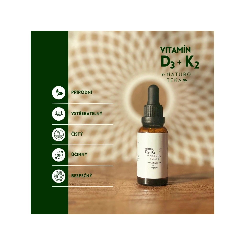 Tento tekutý doplněk stravy od značky NATUROTEKA nabízí vysoce vstřebatelné formy vitamínů D3 a K2. Vitamín D3 je získáván z rostlinných fytosterolů z kůry borovic (EirVit®) a vitamín K2 ve formě menachinonu-7 (MK7) je v 100% trans verzi. Produkt je bez chemických přísad, barviv a aditiv, vhodný pro vegany a neobsahuje lepek, laktózu ani ořechy.