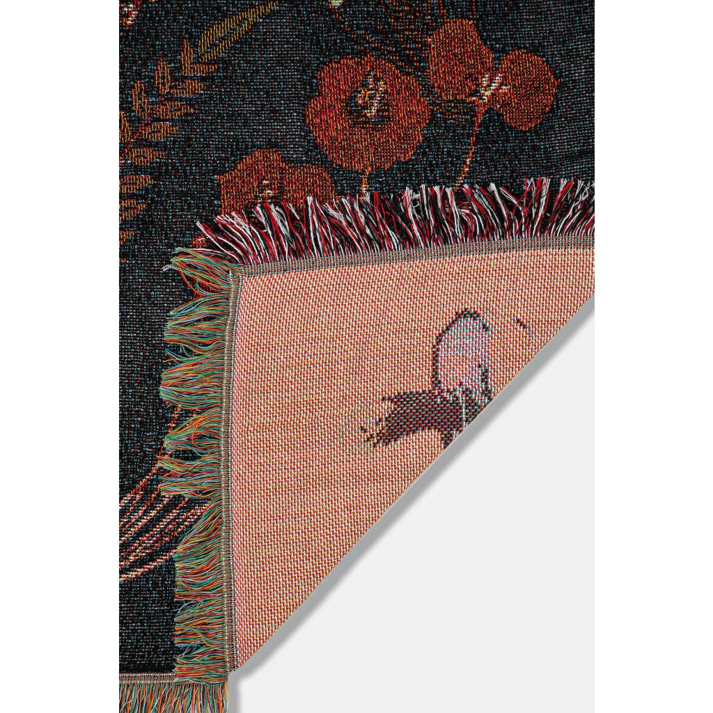 Tato dekorační žakárová deka od značky Medicine měří 160 × 200 cm a je vyrobena ze středně silné žakárové tkaniny s květinovým i zvířecím vzorem a ozdobnými třásněmi.