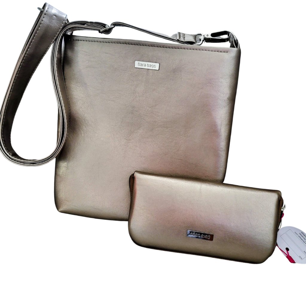 Stylová zlatá kabelka značky Dara bags s ladící peněženkou je dokonalým spojením elegance, praktičnosti a originality. Tato krásná dvojice vnese jiskru do každého dne – ať už ji vezmete do práce, do města nebo na slavnostní příležitost.